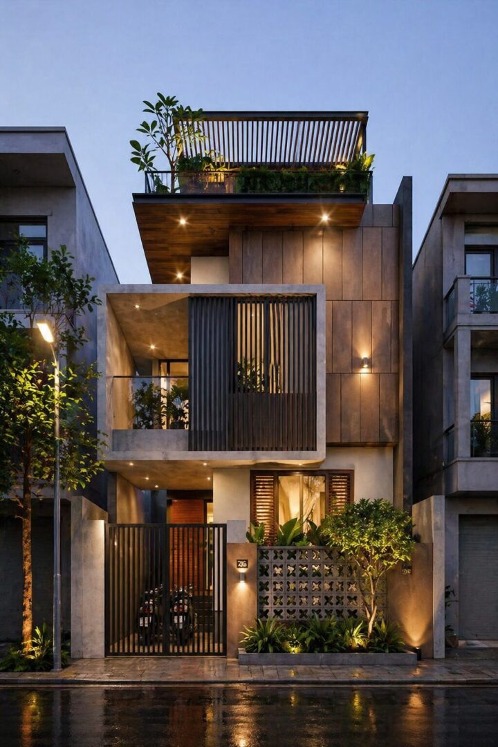 Sự kết hợp giữa các chất liệu hiện đại như kính, bê tông và gỗ làm nổi bật tính năng sử dụng và thẩm mỹ. Thiết kế nhà phố theo phong cách kiến trúc hiện đại không chỉ là nơi ở mà còn phản ánh phong cách sống văn minh và ý thức bảo tồn môi trường.