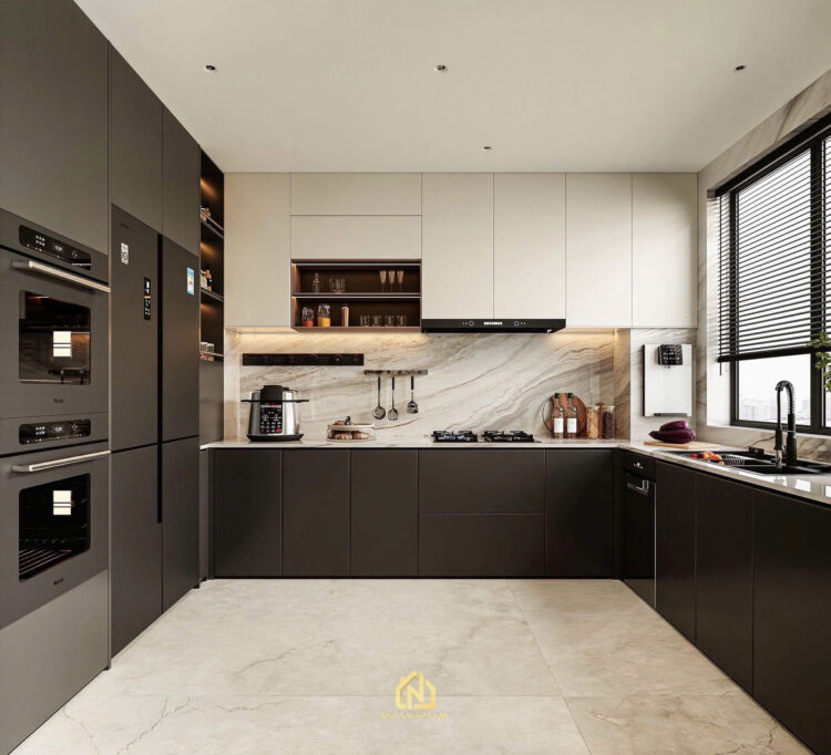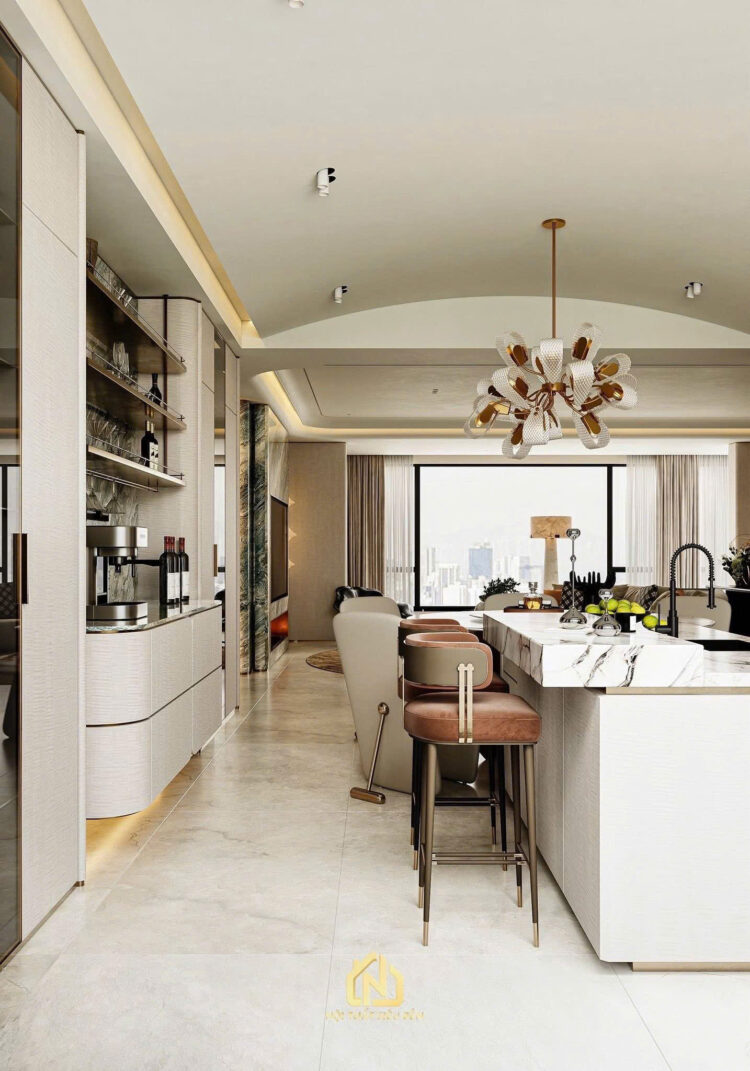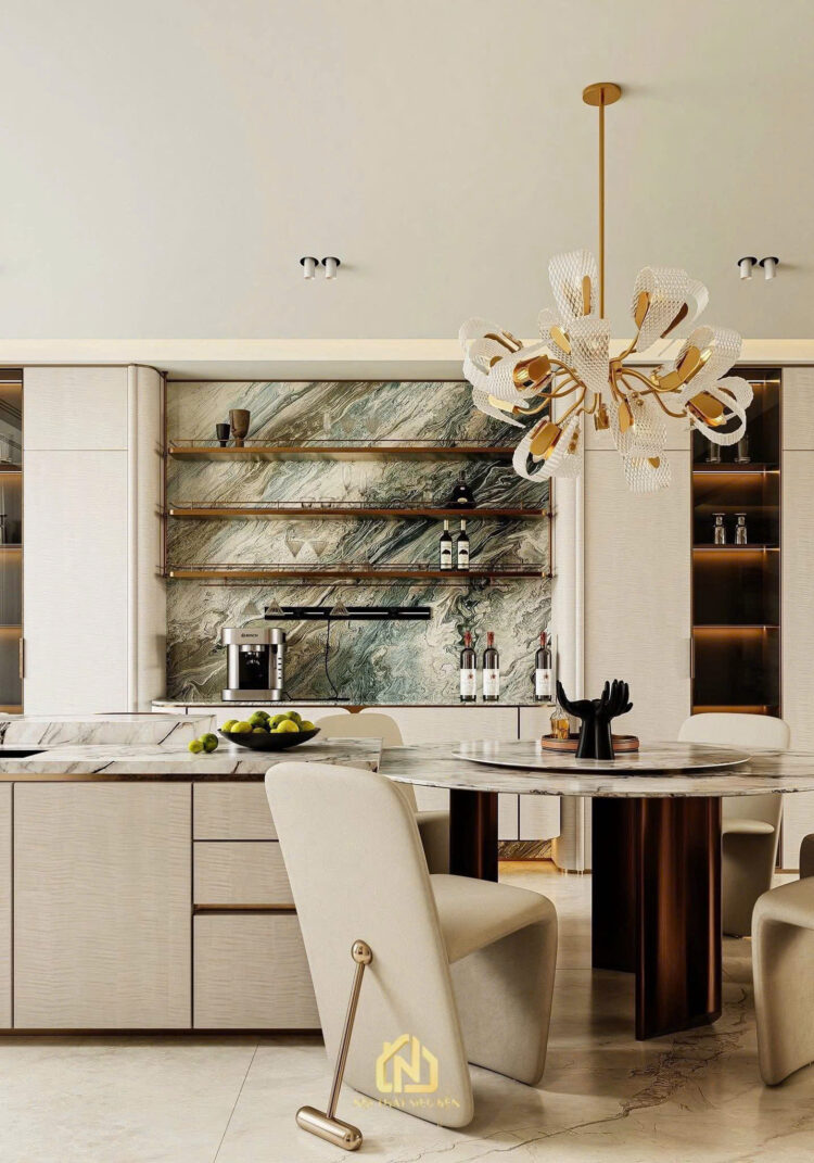 Khu vực bếp và ăn đóng vai trò quan trọng trong sinh hoạt hàng ngày. Thiết kế mở, liên kết với khu vực khách, mang đến cảm giác rộng rãi và dễ tiếp cận. Sự xuất hiện của tủ bếp hiện đại, bàn ăn lớn, cùng với các thiết bị bếp thông minh làm tăng tính tiện nghi trong việc nấu nướng. Khu vực này không chỉ là nơi chế biến và thưởng thức các món ăn mà còn là nơi để gia đình quây quần, chia sẻ những khoảnh khắc hạnh phúc.